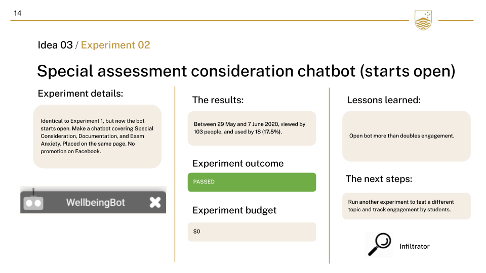 “The interesting thing about experiments is that they are all about context. We ran this in the holiday period, when students do not care about exams or assessment at all - there was no point running the experiment for all students. So we decided to hone in on our customer to students who were seeking special consideration for exams during the holiday period, and were actively searching for help submitting the documentation they needed to provide. This allowed us to gather more reliable information while also solving a problem for students in real time.”